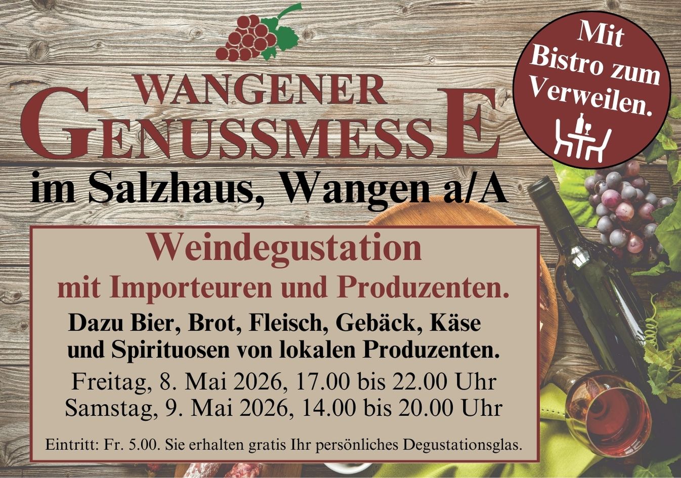 Gönnen Sie sich Genuss! Im Salzhaus lädt ein breites kulinarischens Angebot zum Verweilen und Geniessen ein. Zum Beispiel Weine und Bier zum Degustieren, lokale Produkte wie Käse, frisches Brot und Gebäck und Fleisch sowie ein gemütliches Bistro. Der Treffpunkt für GeniesserInnen im Mai in Wangen an der Aare.